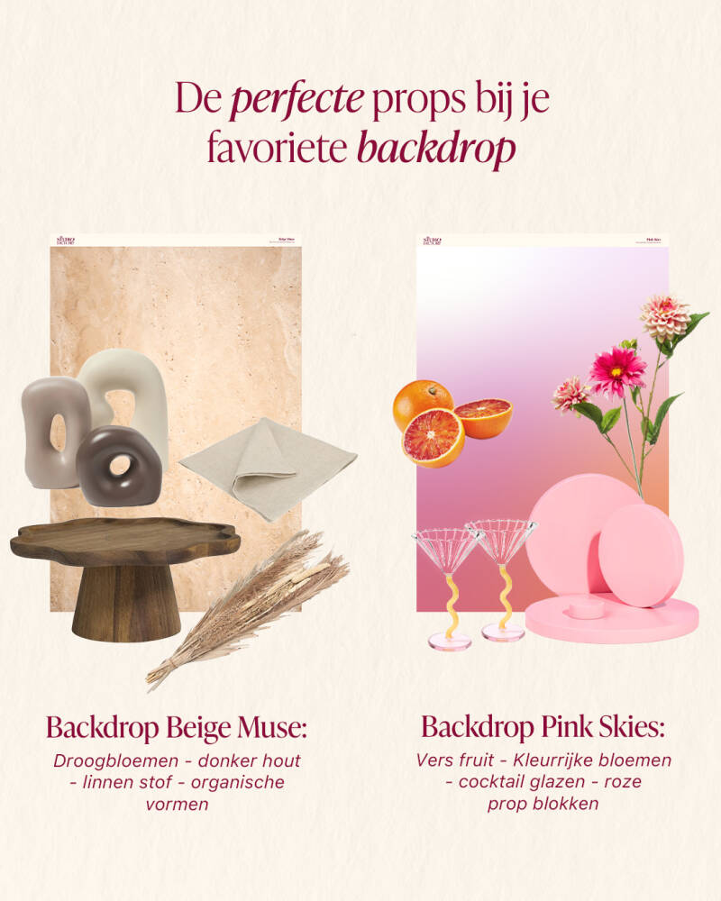 Je product moet altijd de hoofdrol spelen. De props zijn een aanvulling om de sfeer en functie van je product aan te sterken.